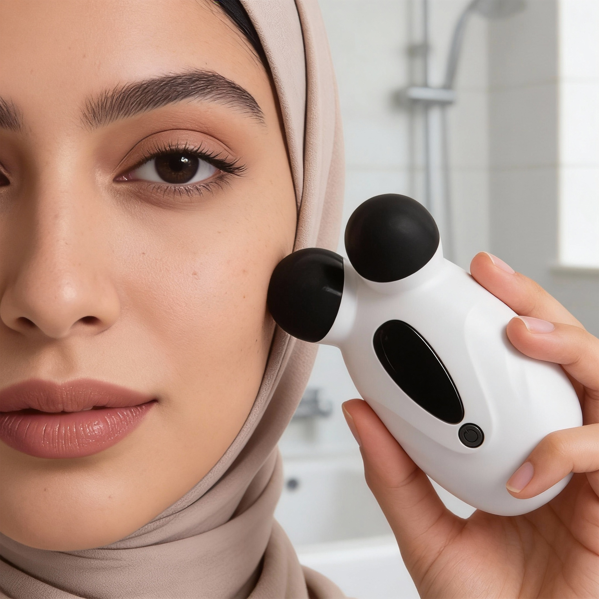 - الرأس المصمم بزاوية V ينزلق بدقة على عظمة الفك والرقبة، مما يساعد على "نحت" الملامح، تقليل مظهر الذقن المزدوج (اللغلوغ)، ورفع الخدود المترهلة ليعطيك مظهراً أكثر شباباً وتحديداً.