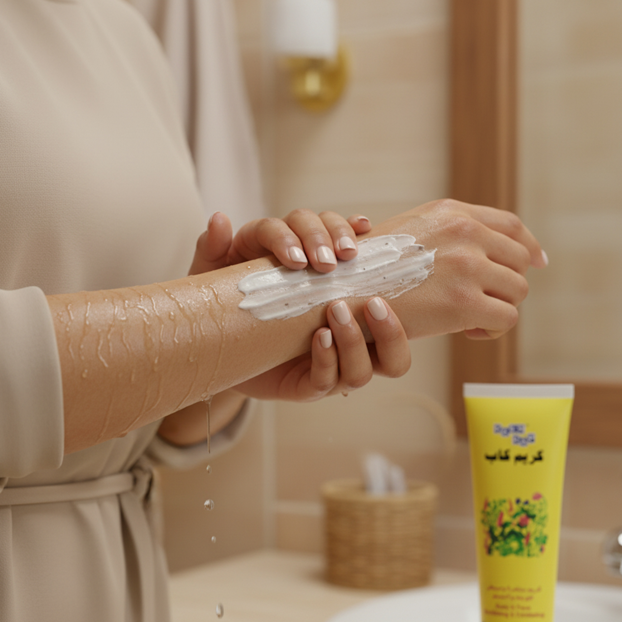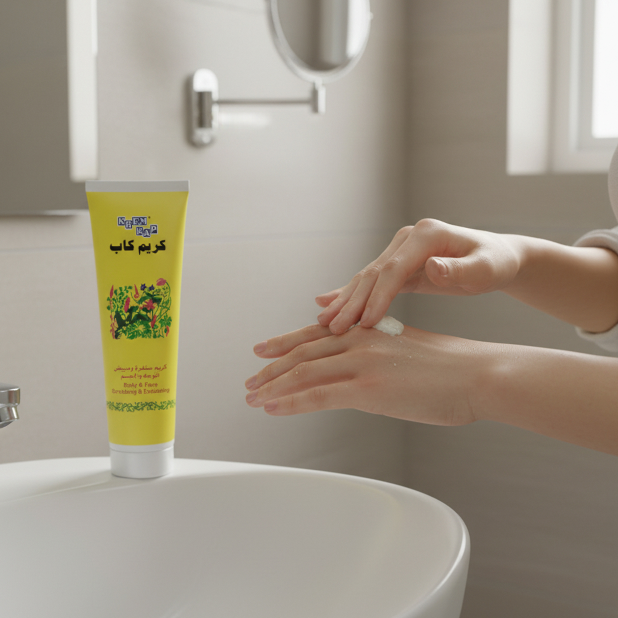 - التوزيع: ضعي كمية وفيرة من كريم كاب على المنطقة المراد تقشيرها (الوجه أو الجسم).