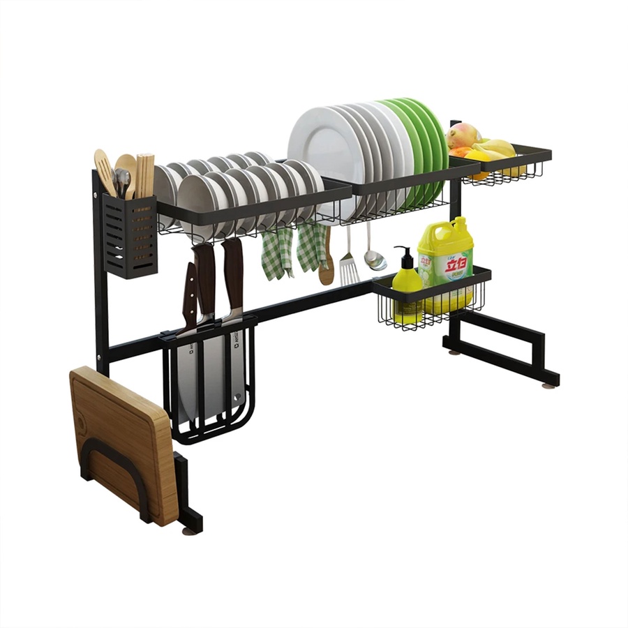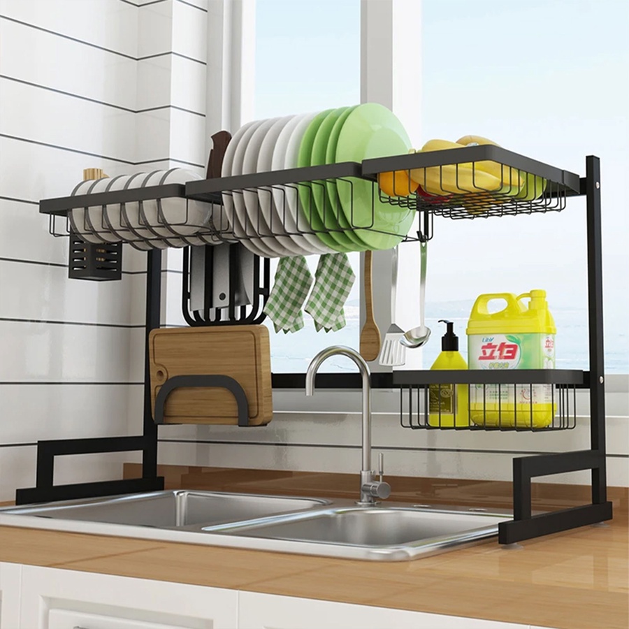 استغلي كل سنتيمتر في مطبخك مع منظم الصحون العملاق (فوق الحوض). تصميم ذكي يحول المساحة الفارغة فوق الحوض إلى "دولاب تخزين" كامل ومكشوف وسهل الوصول.