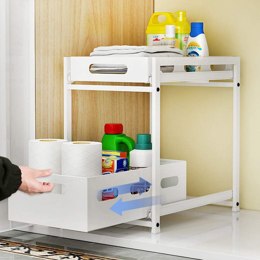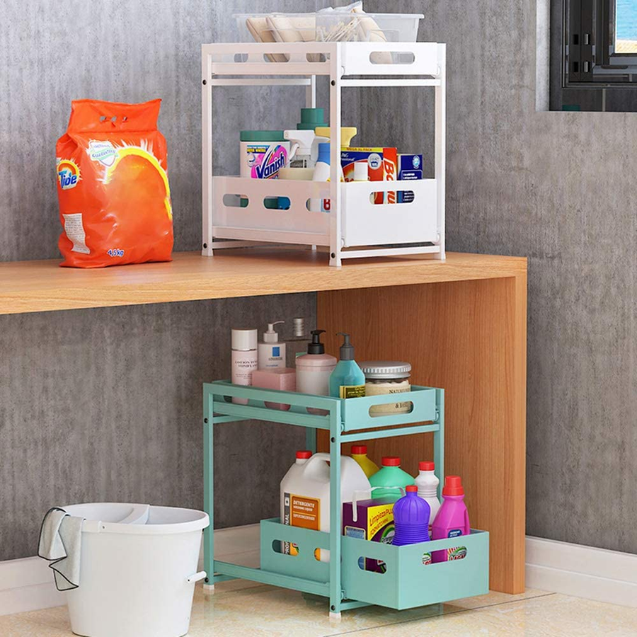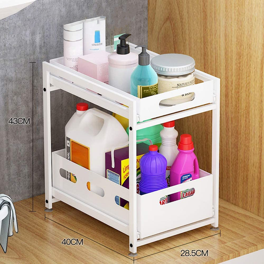 "تخلص من فوضى المنظفات! منظم فولاذي قوي بدرجين سحب لسهولة الوصول. مثالي لتحت الحوض، المطبخ، والحمام. مقاوم للصدأ ويتحمل الأوزان. اطلبه الآن."